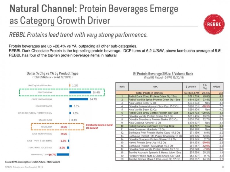 天然渠道和传统销售渠道下,REBBL不同品类销量区分明显:蛋白质饮料是一个持续增长的趋势;因为新的分销机会有限,Elixirs的销量放缓;带果粒的品类增长速度均较慢。