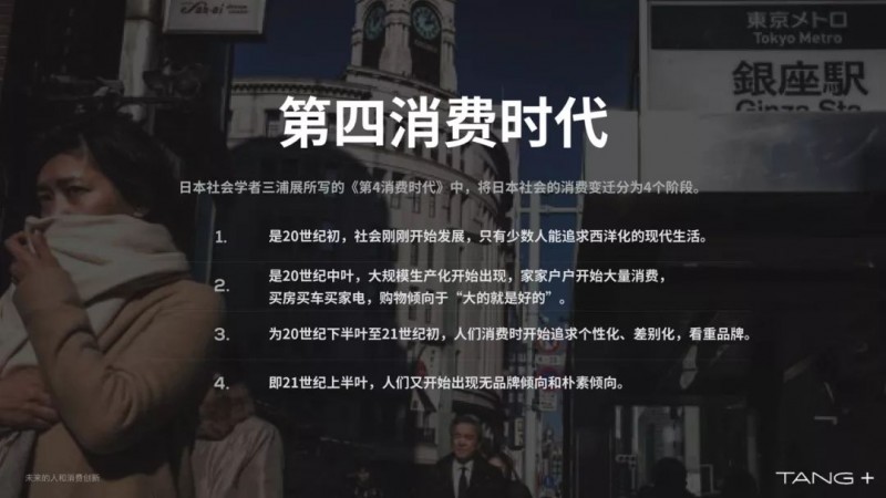 日本有一个学者叫三浦展,做零售的大家都听说过。日本作为我们的邻国,消费变迁经历了四个阶段。第一个是在20世纪初,日本经历了西洋化的阶段,把西方的工业体系逻辑引入到日本,进行了非常快速的工业化。上个世纪中叶开始出现过度消费,到上个世纪末,出现品牌化,到这个世纪初出现无品牌倾向和朴素倾向,我们看到优衣库等等,包括中国有大量追随者、模仿者。在上海这样的城市已经非常明显的出现了这样一个无品牌倾向和朴素倾向的阶段。