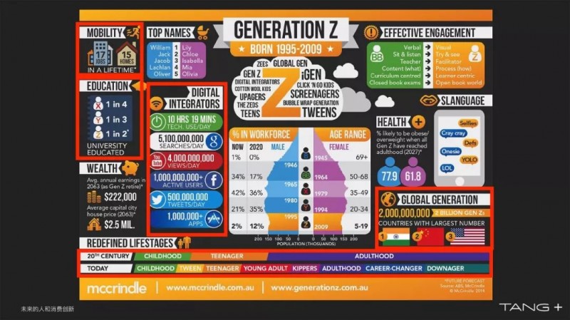 给大家分享一个澳洲的数据,研究现在消费市场当中的绝对主流,95后。第一点,这帮95后全球范围的研究数据,他们一生当中会换17次工作,搬15次家,也就是说居无定所,不会扎根。第二,受教育程度非常高,一半都是受过高等教育。第三,一天当中使用电子产品10个小时19分钟。