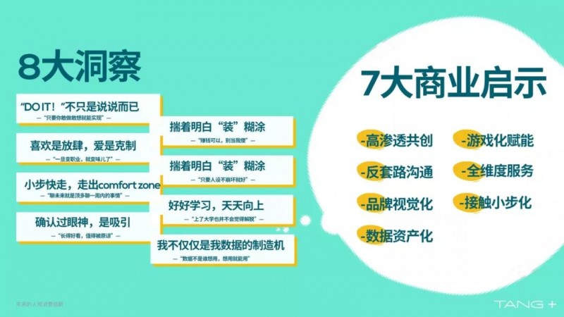 我们做了12年消费者研究,我们深度研究他们生活方式,我们积累了大量消费者画像之后,发现非常有意思的、可以看到消费变迁的趋势。我们去年试图看懂00后,我们招募了一帮00后的小朋友,跟他们一起探讨他们的学习,探讨他们的娱乐,探讨他们的生活,蛮有意思的一些事情。在其中抽象出了五个大的人物画像,并且找到五个大的00后的特征。同时,在五个消费者画像中,找到了八个大的洞察,这些东西可能会影响接下来的商业,并且对商业会有一定的警示。