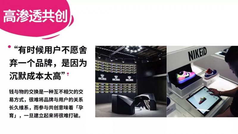 我们提了一个高渗透共创,有时候用户不愿意舍弃一个品牌,因为沉默的成本太高。简单说就是钱与物的交换是互不相欠的交易方式,很难将品牌与用户的关系长久维系,要让用户参与到品牌里面,让他感觉和品牌共同成长,一旦建设起来很难打破。