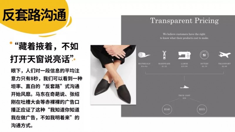 这是一个服装品牌,他很有意思,他把一双鞋最后的价格怎么出来的每一个环节都说出来了,原材料多少钱,成本是59块钱,他要去卖,要卖140块钱或者315块钱,可以自己选,给140也行,给315也行,认可这个设计就给315,和看微信文章赞赏这个文章一样。就像《吐槽大会》张绍刚一样,我就是要做广告,不要遮遮掩掩。