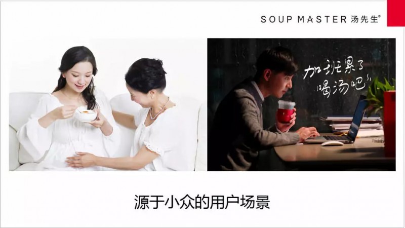 第一个场景,月子中心,它让我们To-C业务有崛起;第二个源于加班场景,跟众多公司合作做了加班汤。因为员工在晚上加班后打开饿了么、美团,往往发现屏幕非常凄惨,屏幕满满的都是小龙虾和烧烤,但是加班人群就想喝一口暖汤或者吃一点东西稍微垫垫肚子,他们并不想吃太多吃太油腻。