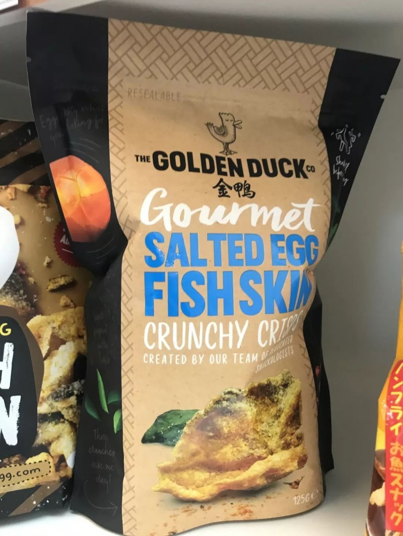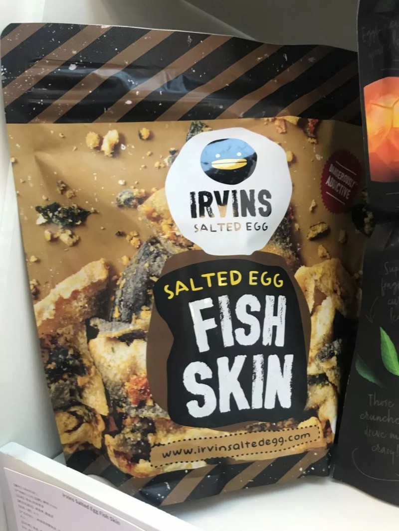 很多人不吃鱼皮,觉得鱼皮口感滑腻,因此不少鱼皮都被浪费了,但现在有人将鱼皮做成了零食。美国的Irvins推出的脆鱼皮,添加了少许香料和美味酱料,不添加任何防腐剂,还是时下比较热门的口味——咸蛋黄。