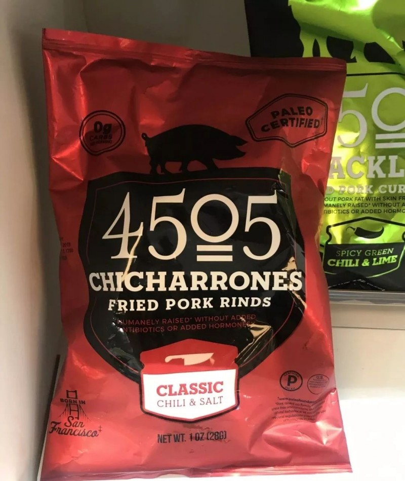 美国4505meats推出的炸猪皮,是用猪油炸的猪皮,口感酥脆饱满,每份含有9克蛋白质,适合生酮饮食爱好者。