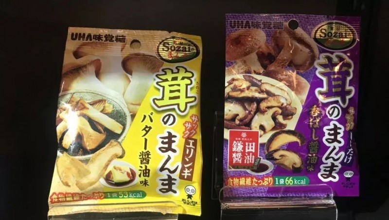 例如日本的UHA味觉糖推出的油炸杏鲍菇,这是一款风格独特的真空炸蘑菇特色零食,真空油炸技术使得杏鲍菇的风味得以最大保留,搭配黄油和酱油,口感香脆,同时还富含膳食纤维,有助于肠胃消化。
