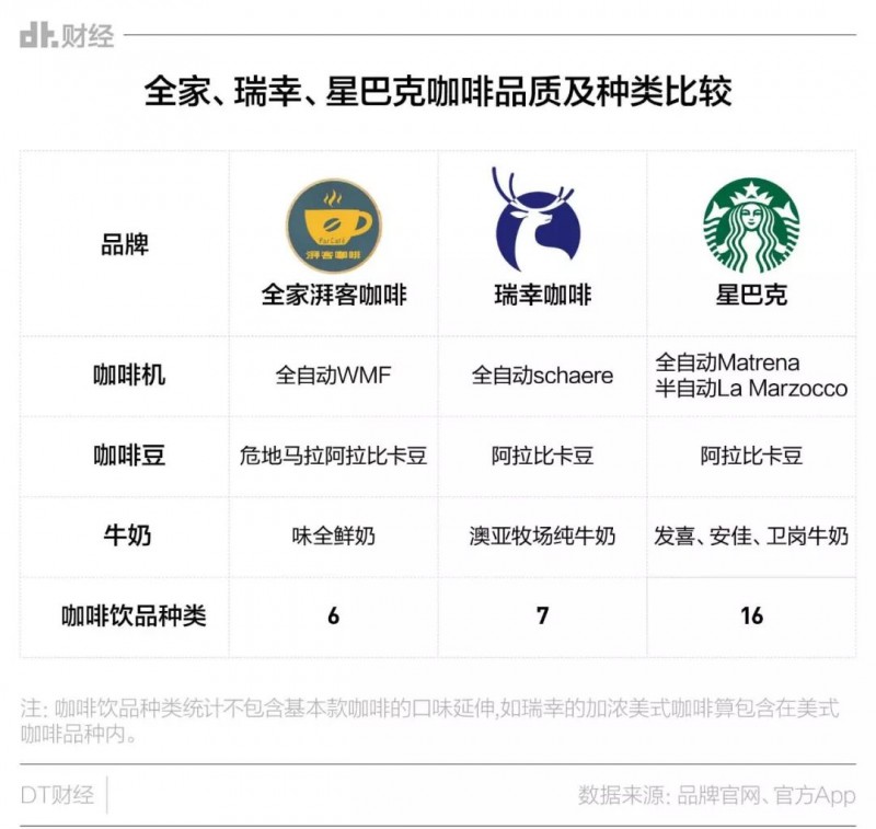 在原材料方面,三家的差距并不大。都选择了比较常规的阿拉比卡豆,毕竟全球70%的咖啡豆都是拉比卡。至于牛奶,瑞幸、星巴克选用了不同品牌的调制乳,而全家湃客则选择了鲜奶。