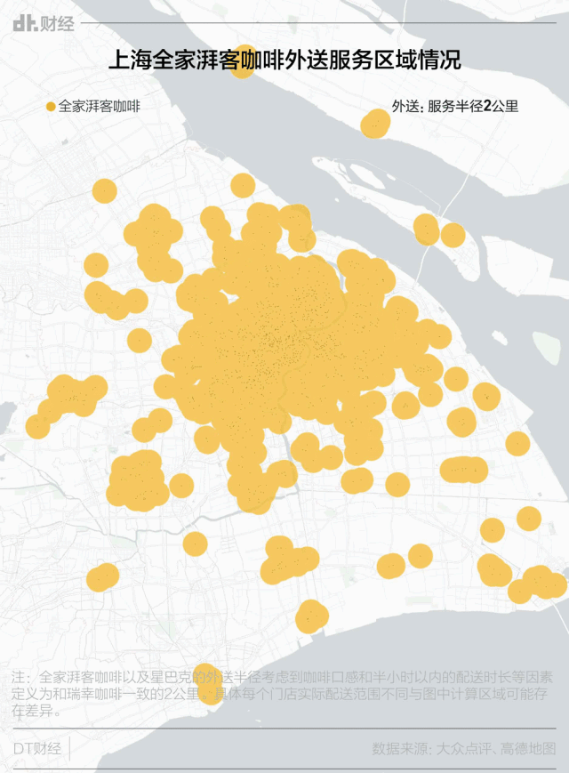 静安区、黄浦区、浦东新区等几个写字楼高密度聚集的区域是三家咖啡品牌交战的重点区域。而无论是在内环、中环还是外环,全家所能触及的服务区域都更多。