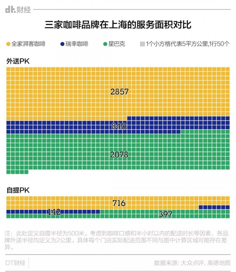 当然,瑞幸的优势还是在外卖。如果以瑞幸的外送势力版图PK全家的自提咖啡势力范围,2公里的配送半径能让它开挂一般胜过线下门店数将近为它的7倍的全家。只是,这个战绩似乎也不具有什么压倒性的优势。