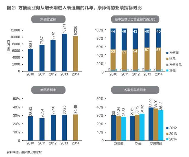 企业最先感受到行业的冷暖变化。方便面市场收缩同期,占据中国方便面市场半壁江山的康师傅业绩接连下滑。方便面业务是康师傅在中国大陆的立足根基,但2013年到2016年,康师傅方便面收入下滑70亿元,对康师傅总收入的贡献从2010年的44%下降至40%,同期饮品从53%增长至57%。2014年,康师傅的方便面业务毛利为28.3%,不仅持续下降,且低于集团同年30.5%的毛利。