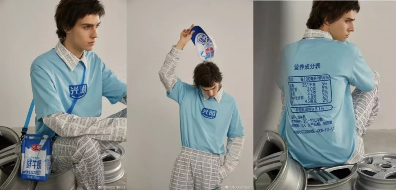 INXX STREET X 光明牛奶系列将怀旧情绪引申到街头,以光明随心订经典的 200ml 玻璃瓶新鲜牛奶原型为灵感,每一款单品上都标识着熟悉的营养配方、产品信息和包装轮廓,塑造出兼具趣味与情怀的潮流。在 INXX 近日举办的 2019 年新品发布会上,这套跨界合作的服饰系列也作为发布会的主推亮相,目前已经正式在天猫平台发售。