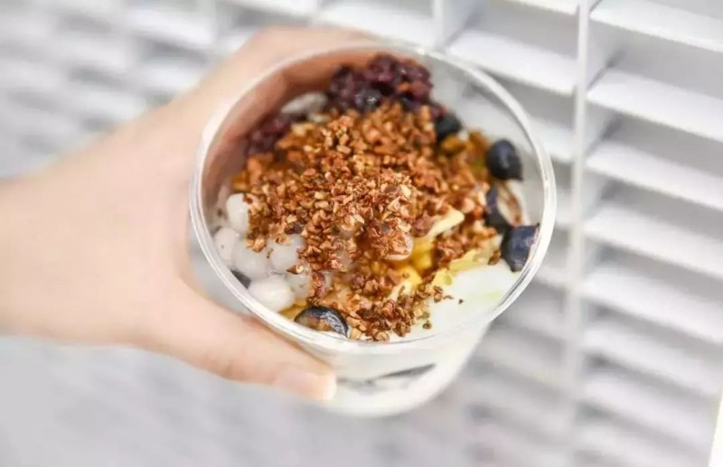 喜茶在今年3月上新的酸奶杯,在大半杯的酸奶上铺上一层鲜果和谷物,颜值在线,价值感UP,但实际鲜果的用量并不多。
