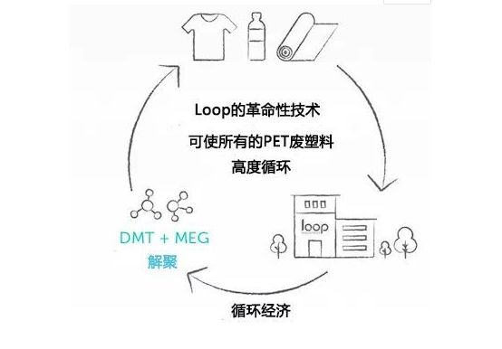 Loop公司成立于2015年,其获得专利的零能耗工艺将废塑料分解成单体塑料-单体乙二醇(MEG)和对苯二甲酸二甲酯(DMT)。在不采用加热或加压的情况下,单体被提纯,除去所有的固体废物和污染,如着色剂,添加剂以及有机和无机杂质。纯化的DMT和MEG被重新聚合成符合食品及药物管理局(FDA)食品级包装要求的Loop品牌PET塑料。
