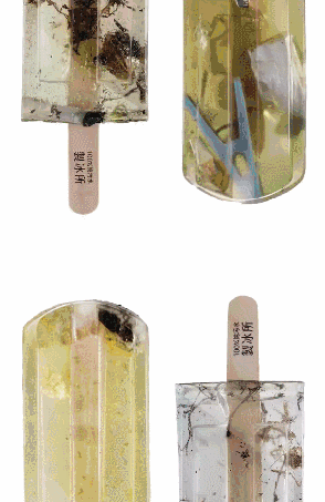 台湾三位姑娘花了整整一年,取了台湾100个污染水源地的水制成冰棍,编好号码,再制作作成1:1的聚酯“冰棒”模型。