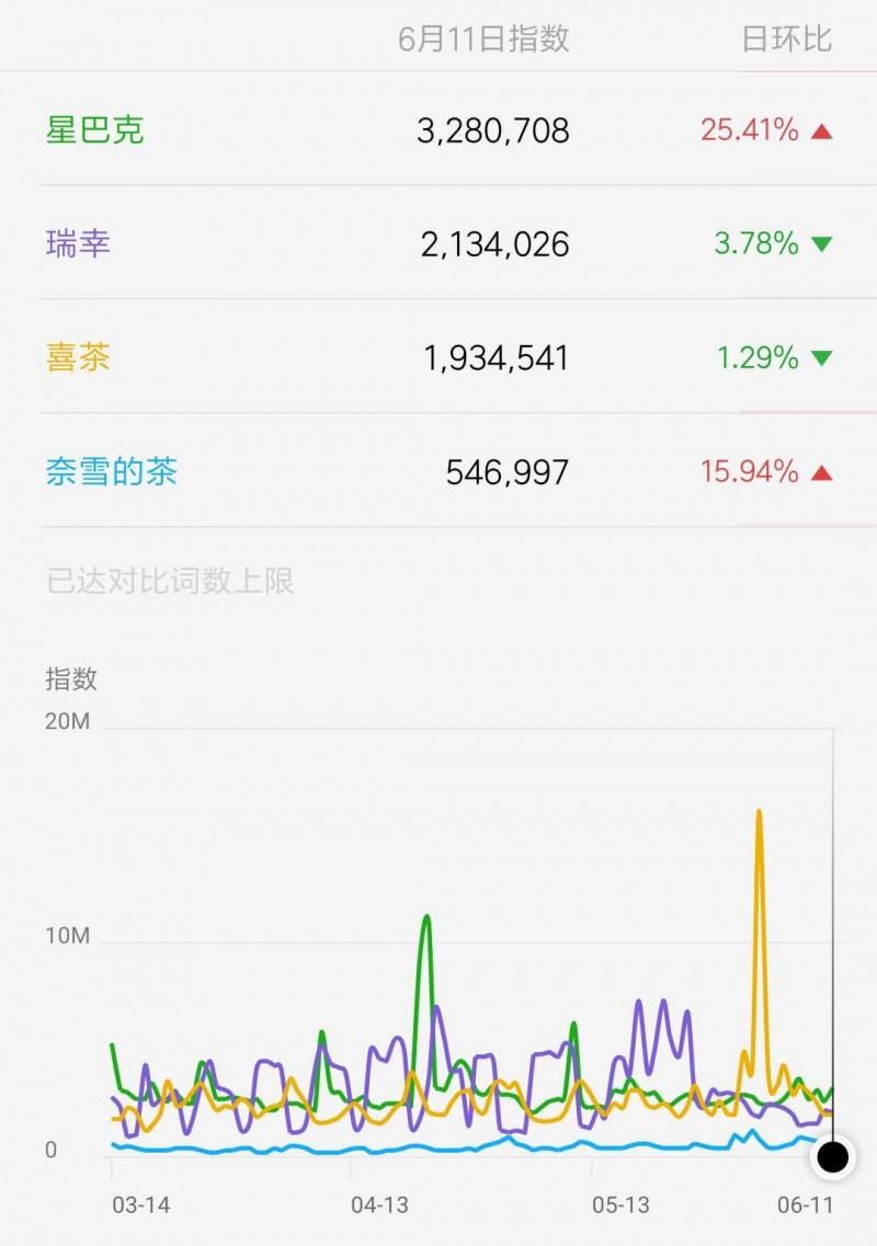 从微信指数上来看喜茶的微信指数在茶饮细分领域中拔得头筹,但是在饮品领域要落后星巴克与瑞幸咖啡,这个微信指数非常有意思,瑞幸能够超越喜茶的一个原因也是因为线上流量裂变与优惠券转发密不可分。