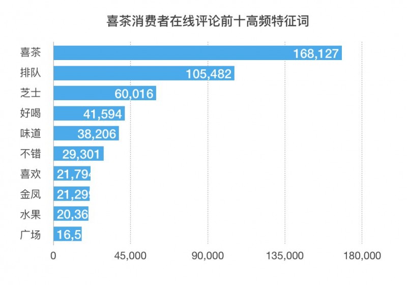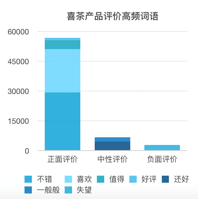 通过产品评价的词语数据对比可以看出在产品层面喜茶的正面评价远高于中性评价和负面评价,这也印证喜茶在产品层面的用心良苦,能够通过产品长期吸引顾客。