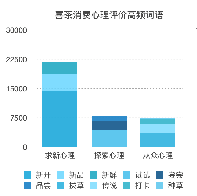 而在探索心理的描述试试、尝尝、品尝为最高频的点评词语,可见新品时时刻刻能够配合品牌效应影响到消费者的探索心理,再结合上文对品种名称、产品评价的高频词汇来看喜茶在产品创新层面做到了成功的差异化打造。
