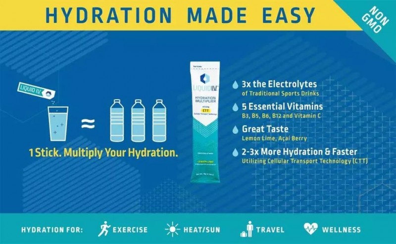 Liquid I.V.是一种口感极佳的非转基因电解质饮料,通过公司独有的“细胞运输技术”(CTT, Cellular Transport Technology),利用由钠、葡萄糖和钾的混合物,将水输送到血液中,更快地为消费者补充水分。