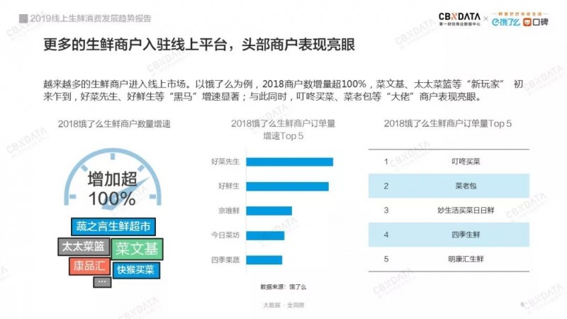 CBNData《报告》显示,以饿了么为例,2018年平台上生鲜商户数增量超100%。叮咚买菜、菜老包等“大佬”商户表现亮眼,总订单量排名靠前,与此同时,好菜先生、好鲜生等成为“黑马”,订单量增速进入前两名并且领先优势明显。