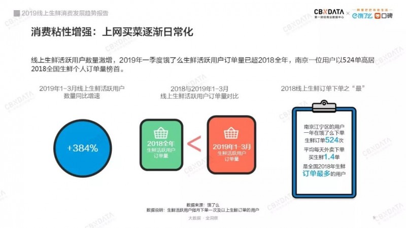 在线下市场,消费者购买最频繁的菜市场主要是为一日三餐的食材做准备,随着80后90后成为家庭买菜的主力,消费者线上买菜习惯日渐养成。CBNData《报告》显示,2019年一季度饿了么生鲜活跃用户订单量已超2018全年,同比增速高达384%。更有南京江宁区的一名用户一年在饿了么下单生鲜订单524次,高居2018全国生鲜个人订单量榜首。