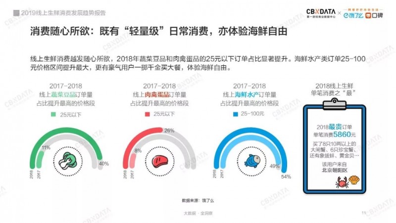 随着线上生鲜消费越发“轻量”和日常化,“鲜”的需求也得到满足。CBNData《报告》显示,从订单的价格来看,随时线上购买之后,2018年消费者蔬菜豆品和肉禽蛋品的25元以下订单占比显著提升。与此同时,消费者也时不时体验一把海鲜自由,海鲜水产类订单25-100元中价段提升最大。