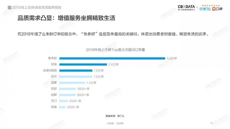 3、消费者对增值服务的需求涌现,在2018年饿了么生鲜订单的留言中,“鱼杀好”是提及率最高的关键词。