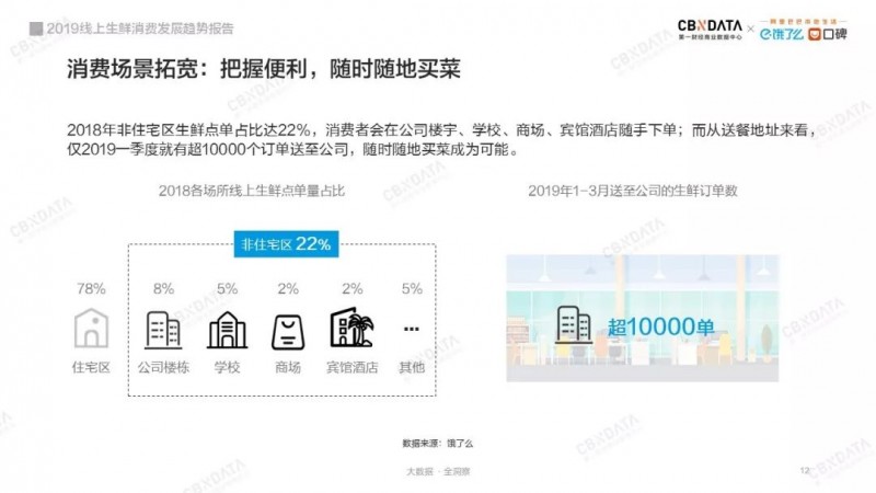 互联网菜场不仅帮上班族实现了“随时买菜”的自由,更实现了“随地买菜”的自由。CBNData《报告》显示,2018年,非住宅区生鲜点单占比达22%,消费者会在公司楼宇、学校、商场、宾馆酒店随手下单,仅2019一季度,就有超一万个订单送至公司。
