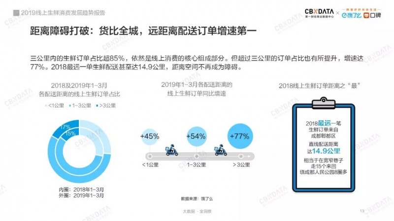 实现随地买菜的自由还体现在“货比全城”后再下单,CBNData《报告》显示,三公里内的生鲜订单占比超85%,依然是配送范围主体。但超过三公里的订单占比也有所提升,增速达77%。2018最远一单生鲜配送甚至长达14.9公里,可见地理空间不再成为障碍,货比全城随心买。