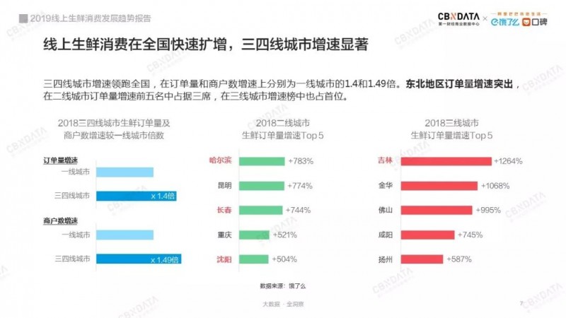 5、越来越多的来自三四线城市的消费者开始在线上选购生鲜商品。在订单量和商户数增速上,三四线城市分别为一线城市的1.4和1.49倍。