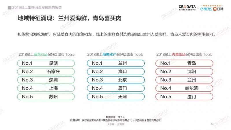 CBNData《报告》显示,2018年线上海鲜水产偏好度最高的城市竟然是位于西北的兰州,而一向以海鲜著名的青岛其实是2018线上肉禽单品偏好度最高的城市。地域饮食偏好的“刻板印象”正在被慢慢改变。