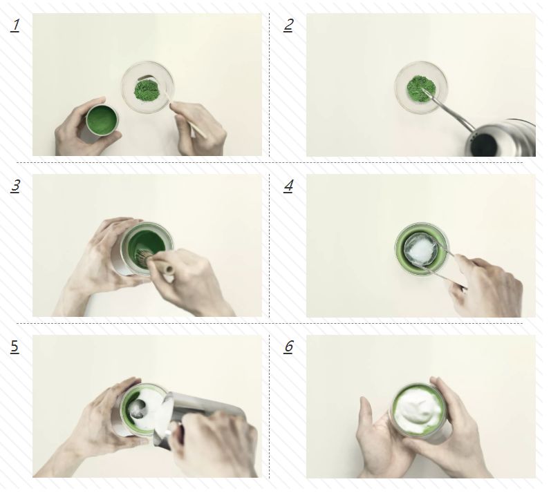 ①取1/2茶匙(约1g)抹茶粉于碗中;②加入1汤匙70℃左右的热水;③用茶筅搅拌均匀;④加入50ml的水和冰块;⑤加入打发的奶泡;⑥尽情享用吧!