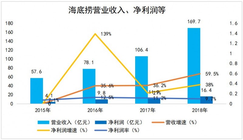 从上面的数据可以看到,海底捞从2016年进入了快速扩张的发展之路:门店数量以每年超过50%的速度增长,海底捞经过前面20年的发展夯实了基础: