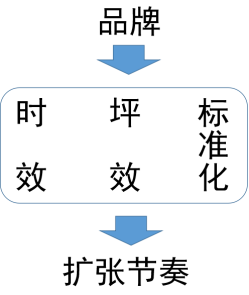 未必。因为在这三个问题之上还有“品牌”,而在这三个问题之下还有“扩张节奏”。“品牌”和“扩张节奏”是战略层面,而“时效、坪效、标准化”只是战术层面,这几个之间的关系用下面的模型来表示。