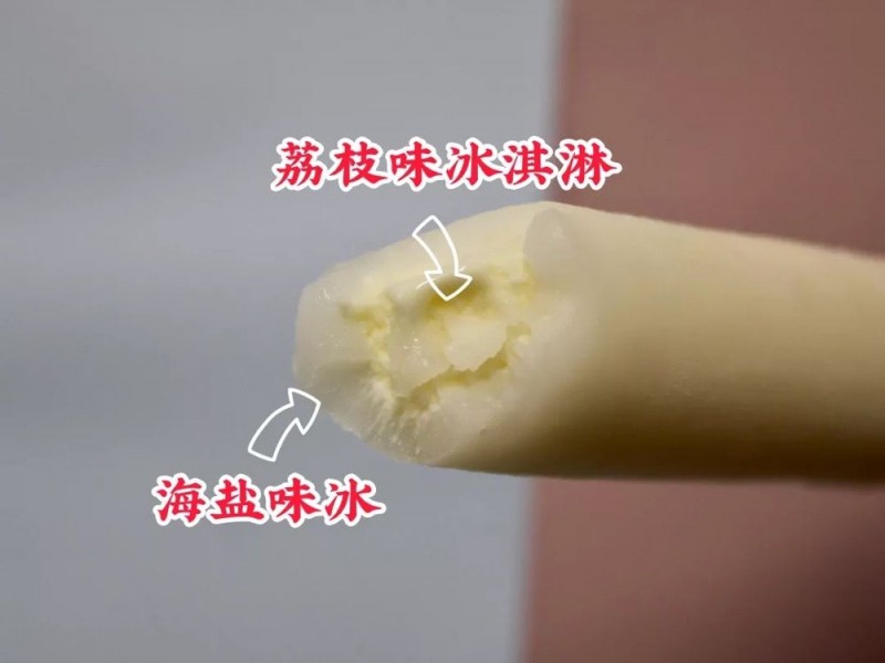 一口下去才发现,外面的奶冰竟然真的是海盐味的,冰沙一样的口感,咬着不费力。里面裹着荔枝味十足的冰淇淋,海盐的咸味和荔枝的甜完美融合,清爽解暑,令人惊喜。