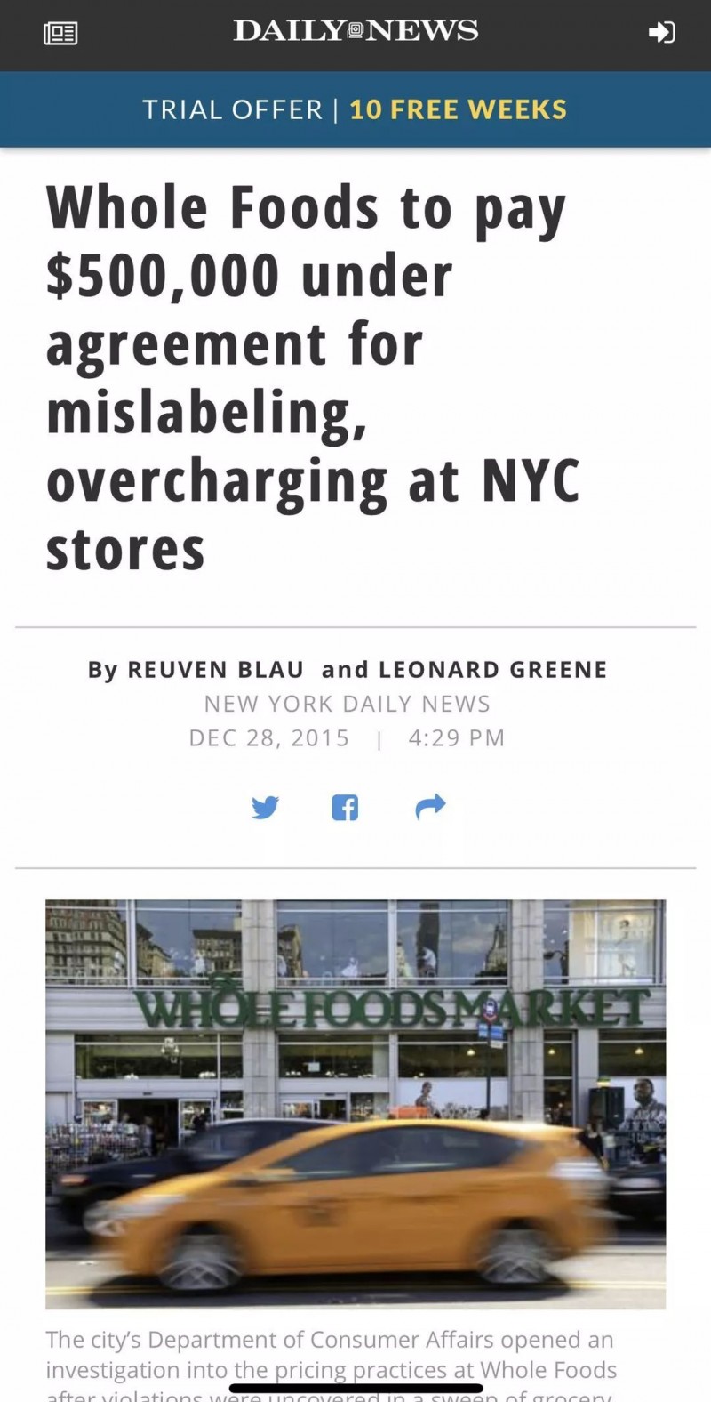 最近几年,Whole Foods的分店越开越多,但公司效益却不见增长。2015年,刚刚被“财富”杂志评为“全球最受赞赏公司”排行榜的第18位,Whole Foods就从口碑到销量都出现了下滑趋势。更是在同年被纽约消费者协会以定价太高而罚款50万美金。