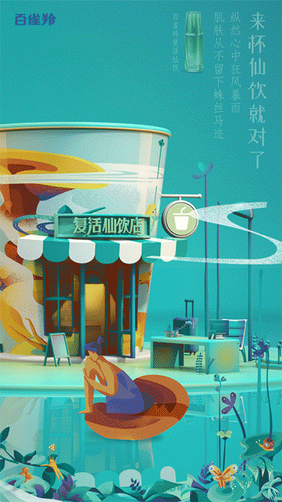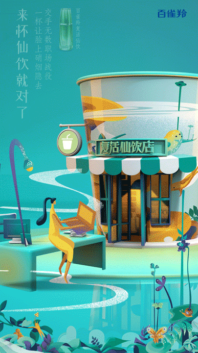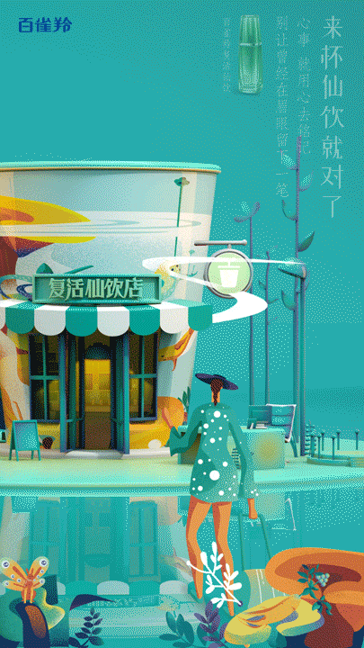 仙饮店视频以3D结合插画形式,呈现于城市的某个街角,阿雀身着服务生围裙带领进入仙饮店,展现一杯百雀羚仙饮的调制过程,三大黄金草本成份,凝聚成一滴仙饮落入杯中,复活996女神、城市新人、熬夜女孩纷纷因它,重新焕发青春能量,抚平压力痕迹,化解沉闷日常,找回18岁少女仙颜。