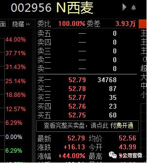 6月19日公司上市首日,开盘即迎顶格上涨,截至记者发稿西麦食品股价上涨44%,为52.79元/股,市值42.23亿元。