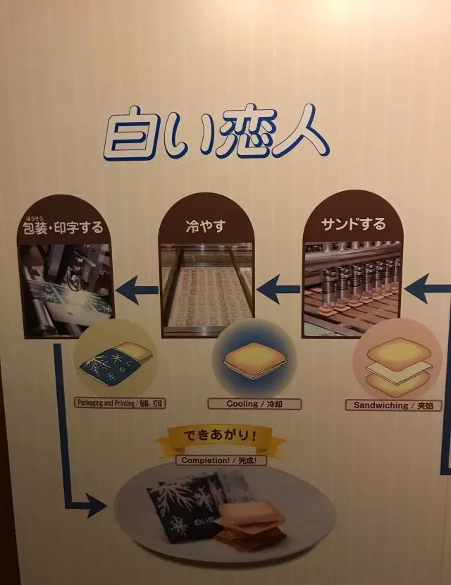在白色恋人工厂的三楼,有一扇巨大的落地玻璃窗,透过这扇玻璃窗可以俯瞰整个“白色恋人”制作车间的全貌,亲眼观察整个生产流程。
