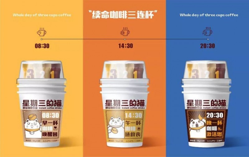 除此之外,更有全国市场独家杯装新品“续命咖啡三连杯”。据厂家介绍,该款新品可帮助“重度懒人”立即唤醒最佳状态,三连杯对应不同的时间段分别是早中晚,包装更是情景式再现不同时段的状态,萌趣十足。