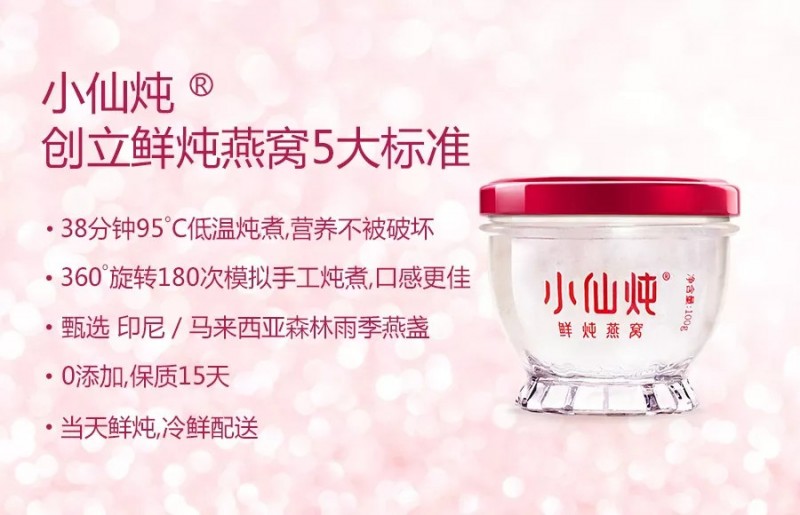 2016年8月,小仙炖率先在行业里发布鲜炖燕窝标准,如今,当天鲜炖、冷鲜配送、0添加、保质15天等已成为鲜炖燕窝行业的公认标准。