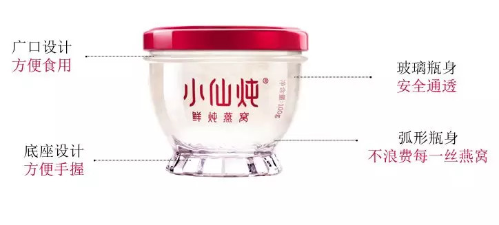小仙炖的产品瓶型也在引领着整个行业的包装风向。为了还原用户用碗吃燕窝的习惯,林小仙曾翻阅典籍,研究乾隆年间皇家服用燕窝时的器皿。最终在顶尖工业设计团队洛可可(LKK)操刀下,将传统与现代工艺相结合,设计出现在的瓶型:瓶口从业内统一的小口变成大口碗形,不仅贴合传统碗食燕窝习惯,同时解决普遍存在的瓶底死角问题;瓶底应用了仿钻石纹设计以增加摩擦力利于手握开盖。