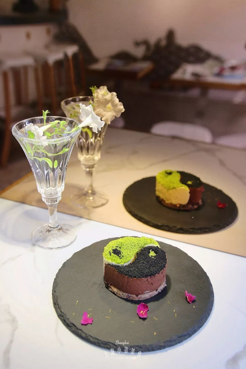 店里的甜品小资君几乎都滚过一遍了,这次就点了新出的“无极”蛋糕。造型像是一个太极的阴阳图案,口味也有2种,分别是生巧克力和柠檬奶酪。