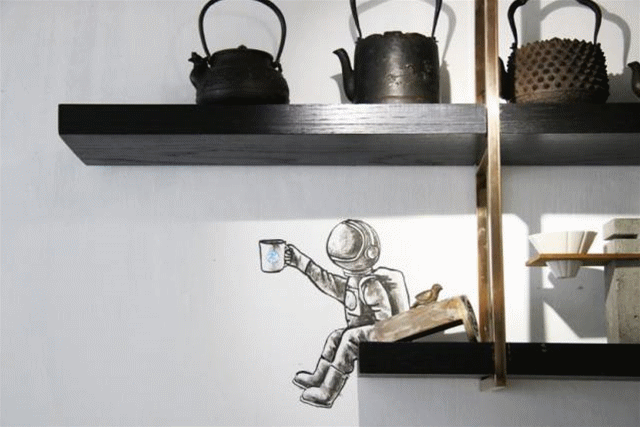 白色大理石桌面,木质纹路墙面,以及线条明朗的顶灯,看上去似乎有些性冷淡的意味,但没想到店里还隐藏了几处奇趣的太空元素!