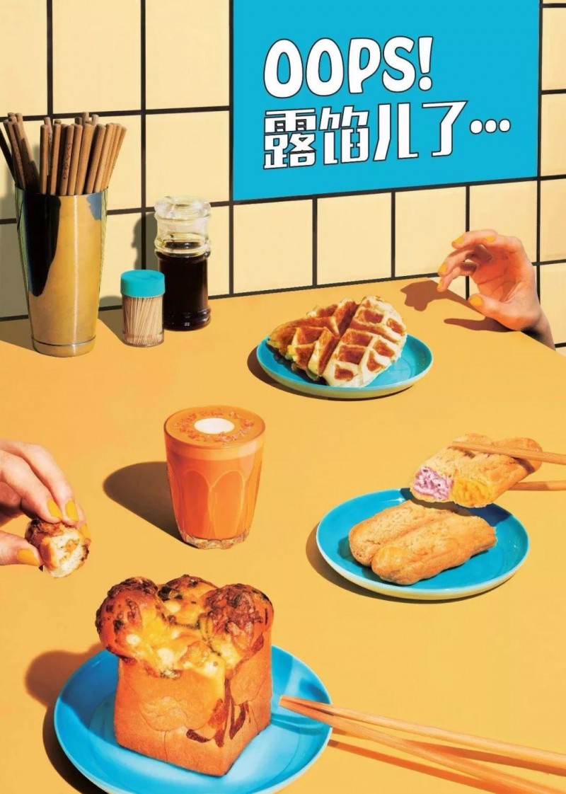今年三月,Seesaw推出了一系列春季限定美食,主题为“露馅儿”。从主题海报上便能窥见一些端倪——一只充满欲望的小手伸向餐桌上长得稀奇古怪的食物。名字也很怪,揪揪盒、霹雳茶拿铁、双截棍……听着很是让人摸不着头脑。