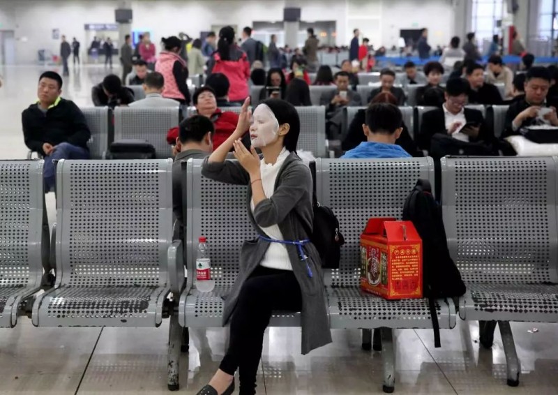 2015年10月31日,浙江义乌火车站候车厅,一位候车的女孩子正在做面膜