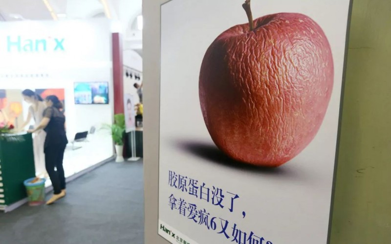 2014年7月4日,第三届北京国际顶级生活品牌(奢侈品)博览会上,苹果胶原蛋白没了,拿着爱疯6又如何广告