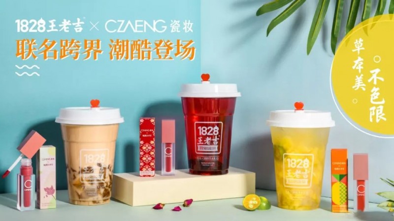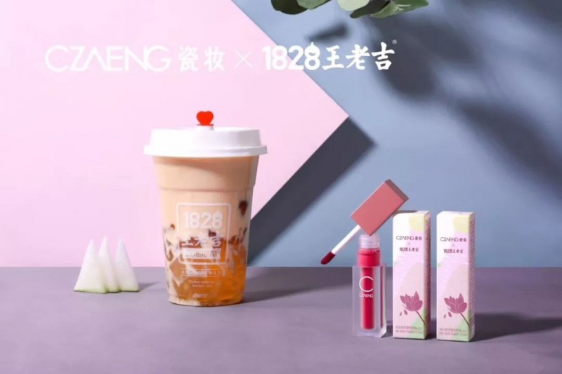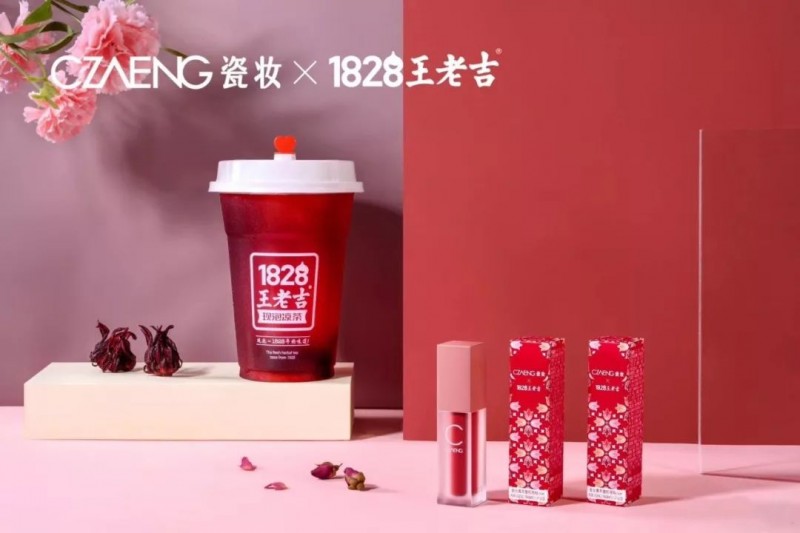 三款1828王老吉现泡茶饮对应三款不同色号的唇釉,以“草本植物精粹,美唇更护唇”为口号,联名跨界。