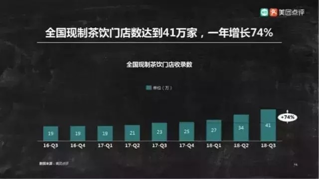 数据报告显示,2018年,我国茶饮市场全面爆发,截止到2018年第三季度,全国现制茶饮门店数达到41万家,一年内增长74%。