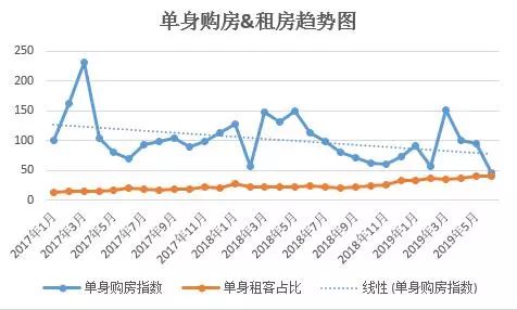 先正视一个悲催的事实:在2016、2017年房价大涨过后,一线城市的房价已远远超出了单身狗的承受能力。从2017年1月开始,单身群体的交易量虽偶有起伏,但整体呈现出的是稳定下滑的趋势。与此相反,在租房群体里单身的占比却在逐月攀升,从最初的12.6%增长到最近的接近40%。这种情况有可能是因为租房市场在承接丧失购房能力的单身人群,导致单身占比攀升。