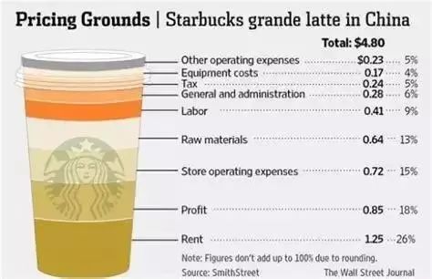 而根据公开数据,星巴克的房租成本只占到了售价的15%左右,(其他都是装修和运营成本,查了很多资料,星巴克财报没有精确到到单个门店具体租金成本,这也是星巴克的秘密所在)